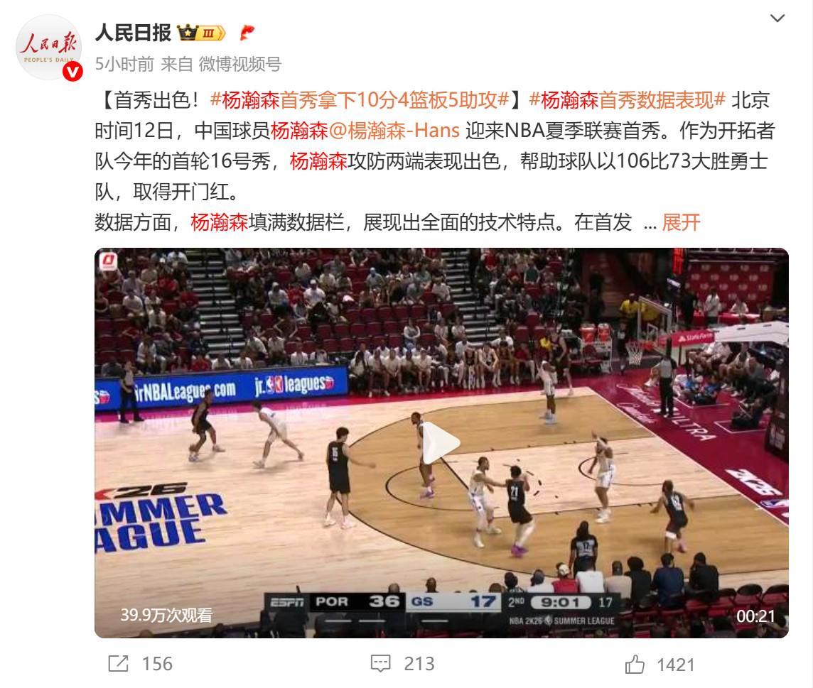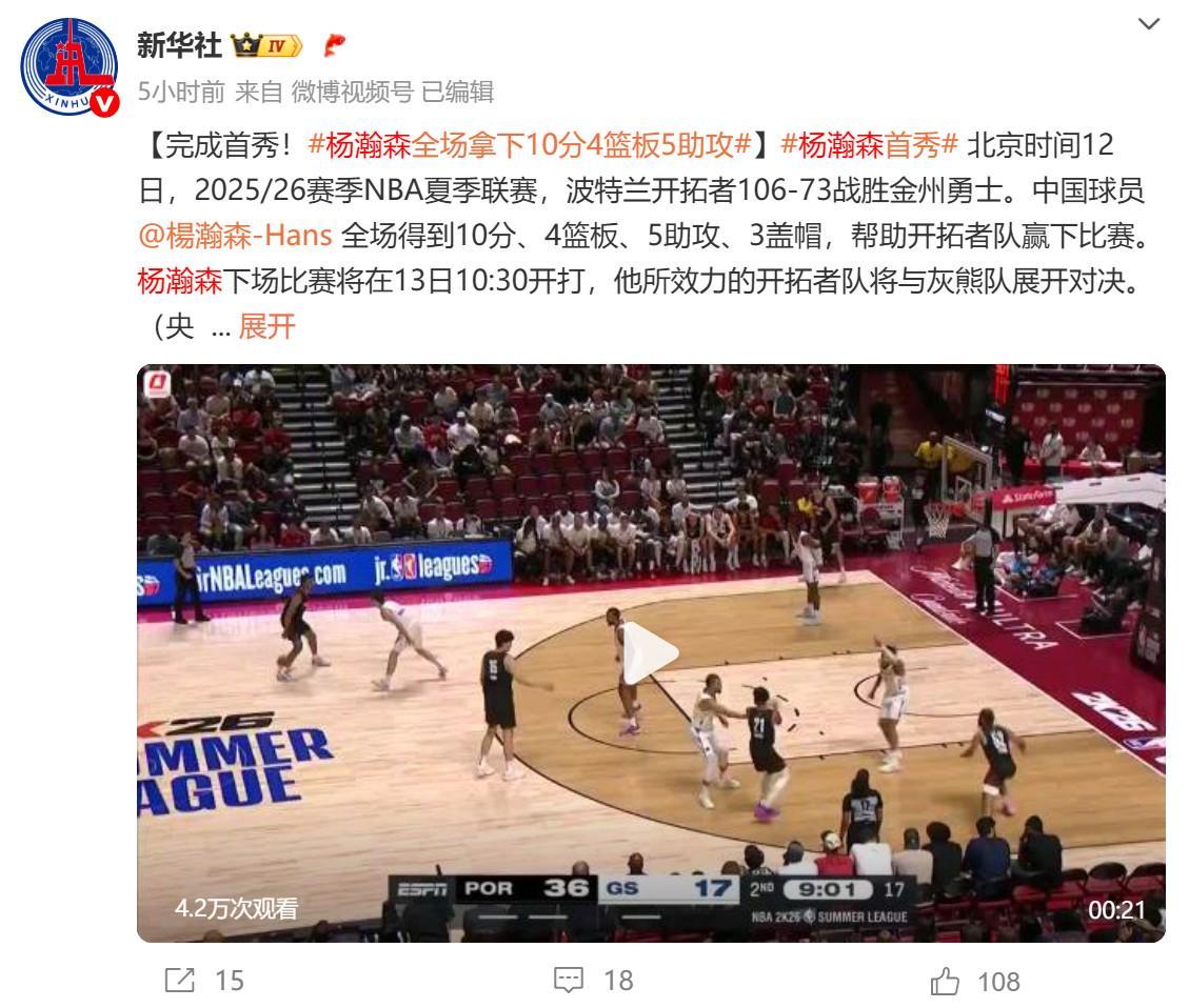 杨瀚森今日完成夏联首秀,新华社、人民日报和央视新闻均转发